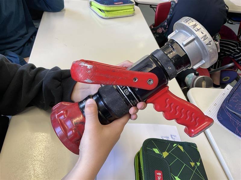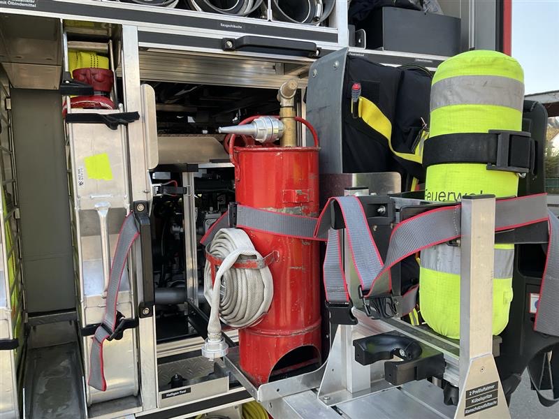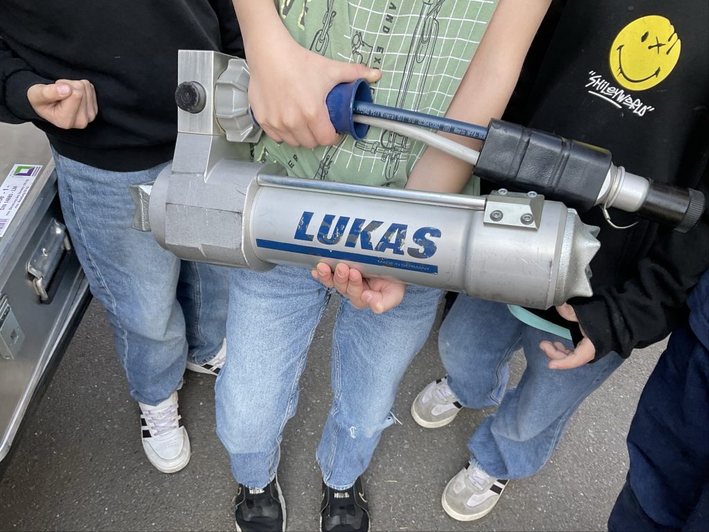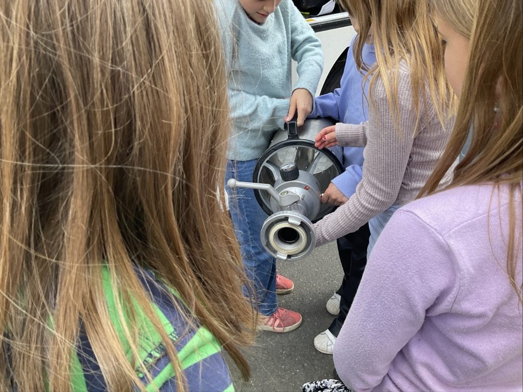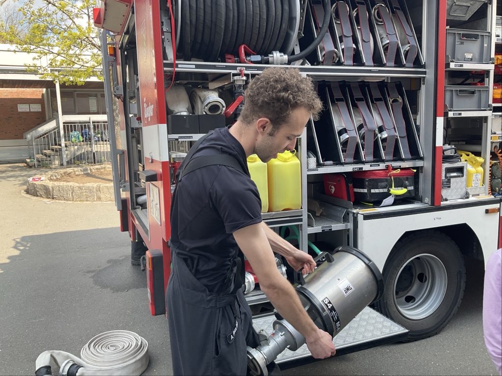 Danach ging es nacheinander auf den Pausenhof, wo das Feuerwehrauto bereits wartete. Jede Klasse konnte das Einsatzfahrzeug genauer ansehen und sich erklären lassen, welche Geräte darin untergebracht sind und wofür sie verwendet werden. Besonders eindrucksvoll war es für die Kinder, einige der Ausrüstungsgegenstände selbst in die Hand zu nehmen und zu heben. Dabei wurde deutlich, wie schwer die Geräte teilweise sind und welche körperliche Fitness für den Feuerwehrdienst erforderlich ist. Auch das Ausrollen des Feuerwehrschlauchs wurde vorgeführt und sorgte für großes Interesse.