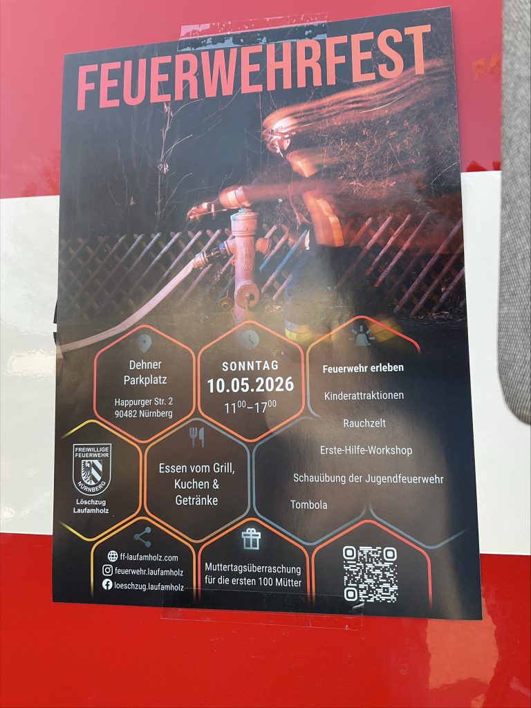 Wer einen weiteren Einblick in die ehrenamtliche Arbeit der Feuerwehr bekommen möchte oder Interesse an einer Mitarbeit hat, hat am 10. Mai die Gelegenheit dazu. An diesem Tag findet das Feuerwehrfest der Freiwilligen Feuerwehr Laufamholz auf dem Dehner-Parkplatz statt. Besucherinnen und Besucher erwartet dort ein abwechslungsreiches Programm mit Kinderattraktionen, einem Rauchzelt zum Ausprobieren, einem Erste-Hilfe-Workshop, einer Schauübung der Jugendfeuerwehr sowie einer Tombola. Für das leibliche Wohl ist ebenfalls bestens gesorgt: Es gibt Essen vom Grill, Kuchen und Getränke.