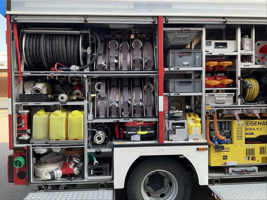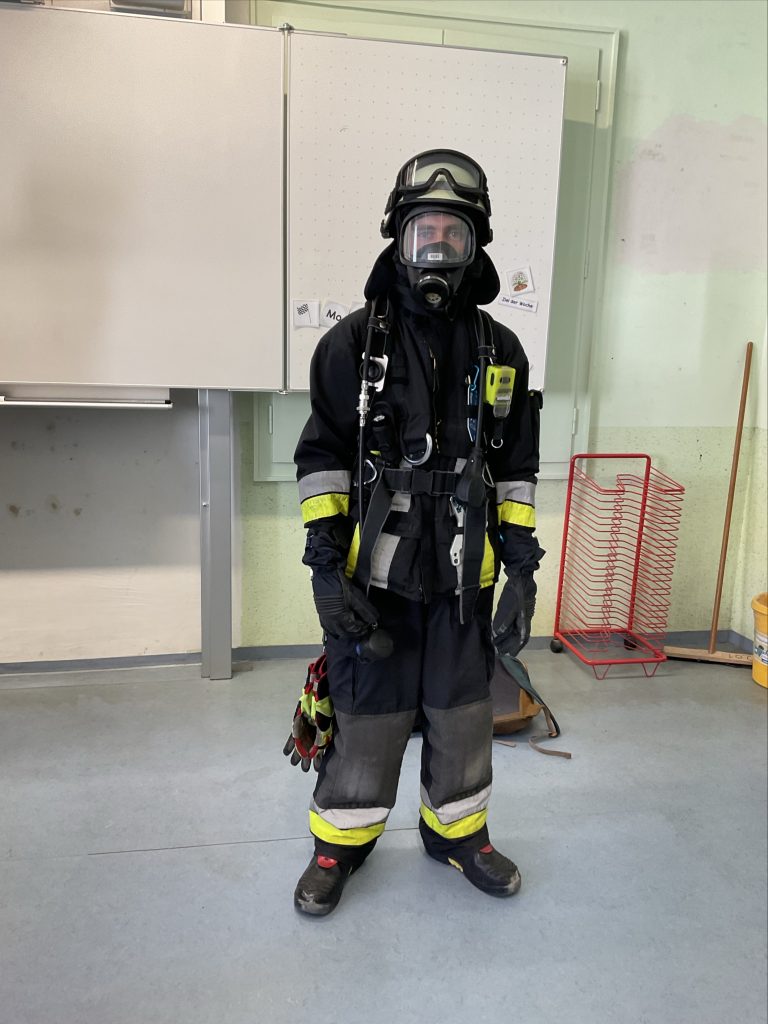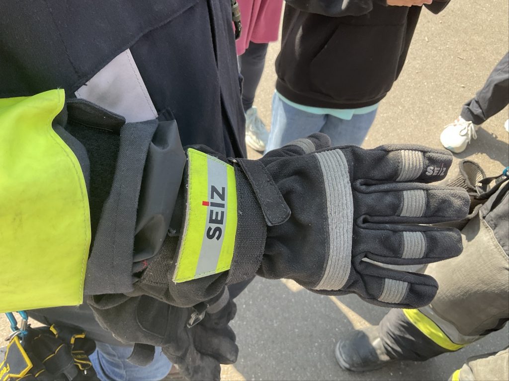 Darüber hinaus durften die Kinder ins Feuerwehrauto steigen und Teile der Schutzausrüstung – Helm, Jacke und Handschuhe – selbst anprobieren. So konnten sie den Alltag der Feuerwehrleute noch besser nachvollziehen.
