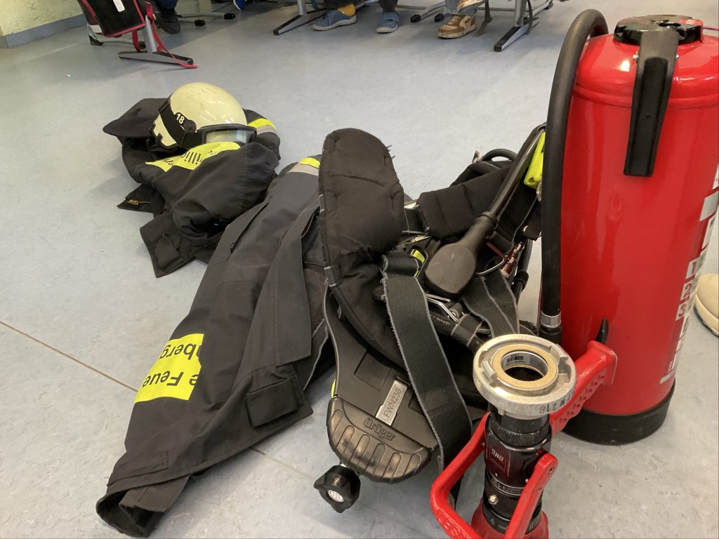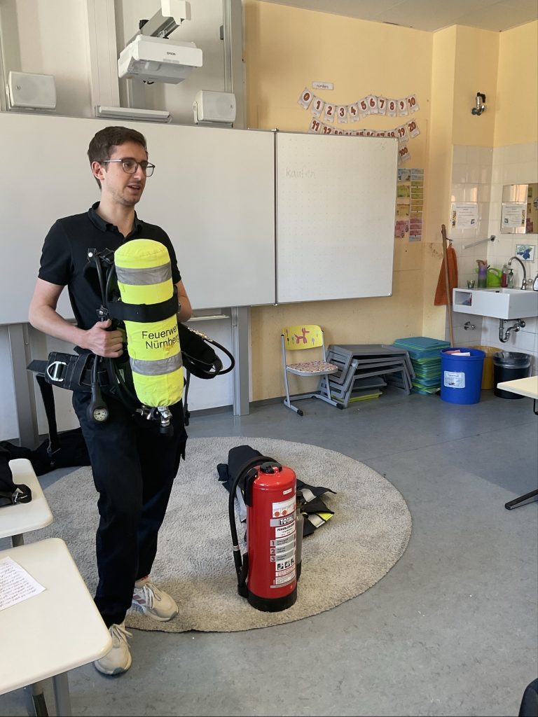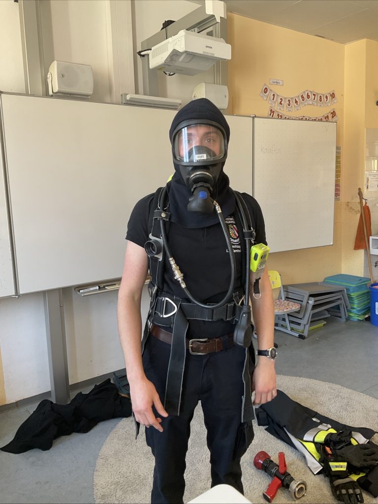 Zu Beginn traf sich jeweils eine der dritten Klassen im Klassenzimmer mit den Feuerwehrleuten Marc, Alex und Finn. Dort stellten sie ihre Aufgaben bei der Feuerwehr vor und erklärten ihre persönliche Schutzausrüstung. Dabei wurde deutlich, wie vielfältig und verantwortungsvoll die Einsätze der Feuerwehr sind. Im Anschluss hatten die Kinder die Gelegenheit, ihre vorbereiteten Fragen zu stellen und erhielten geduldige und kindgerechte Antworten.