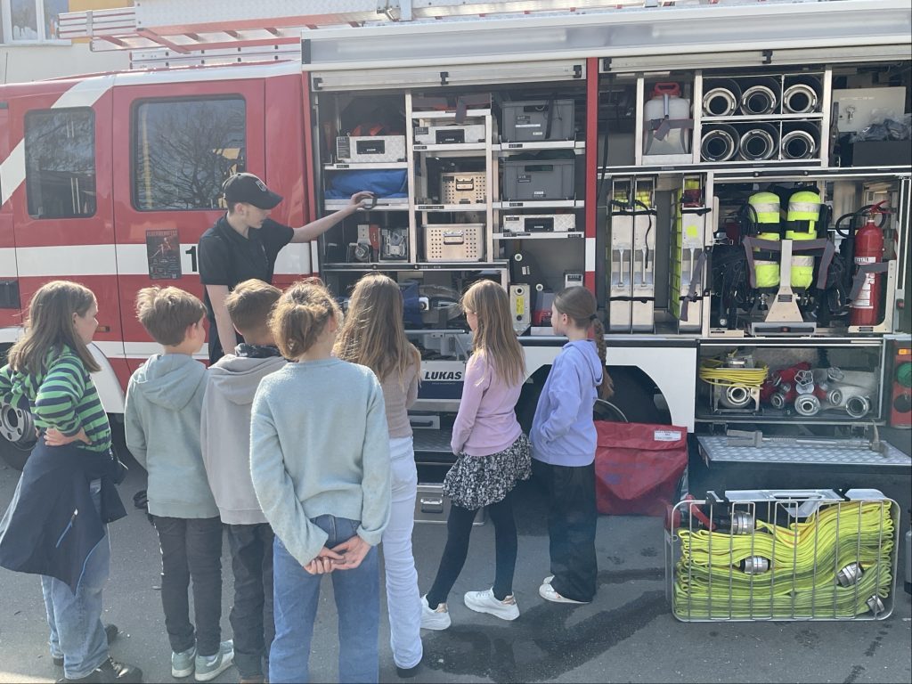 Die Feuerwehrleute nahmen sich viel Zeit und begleiteten alle drei dritten Klassen nacheinander, sodass jede Gruppe ausführlich informiert wurde und viele Fragen stellen konnte.