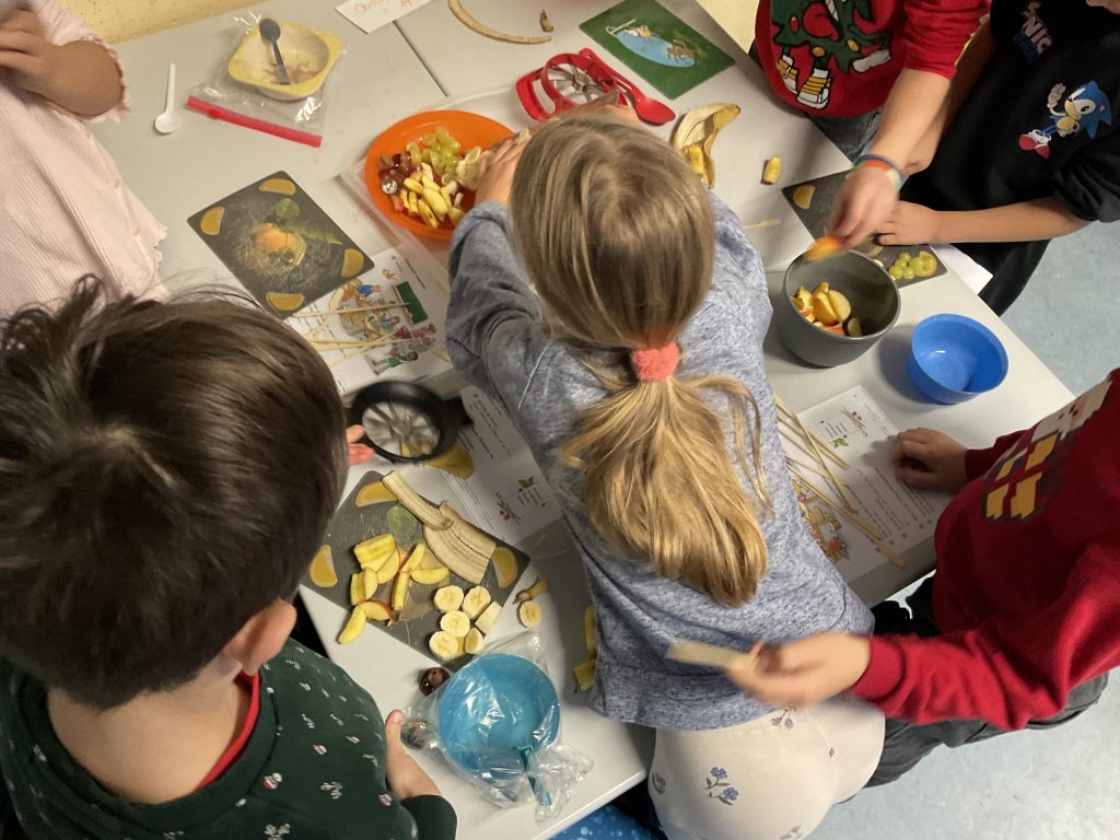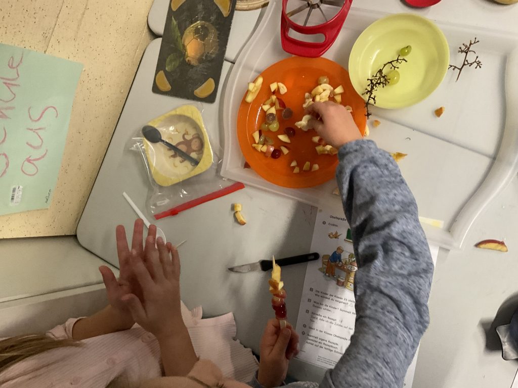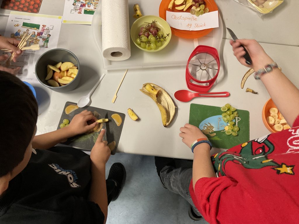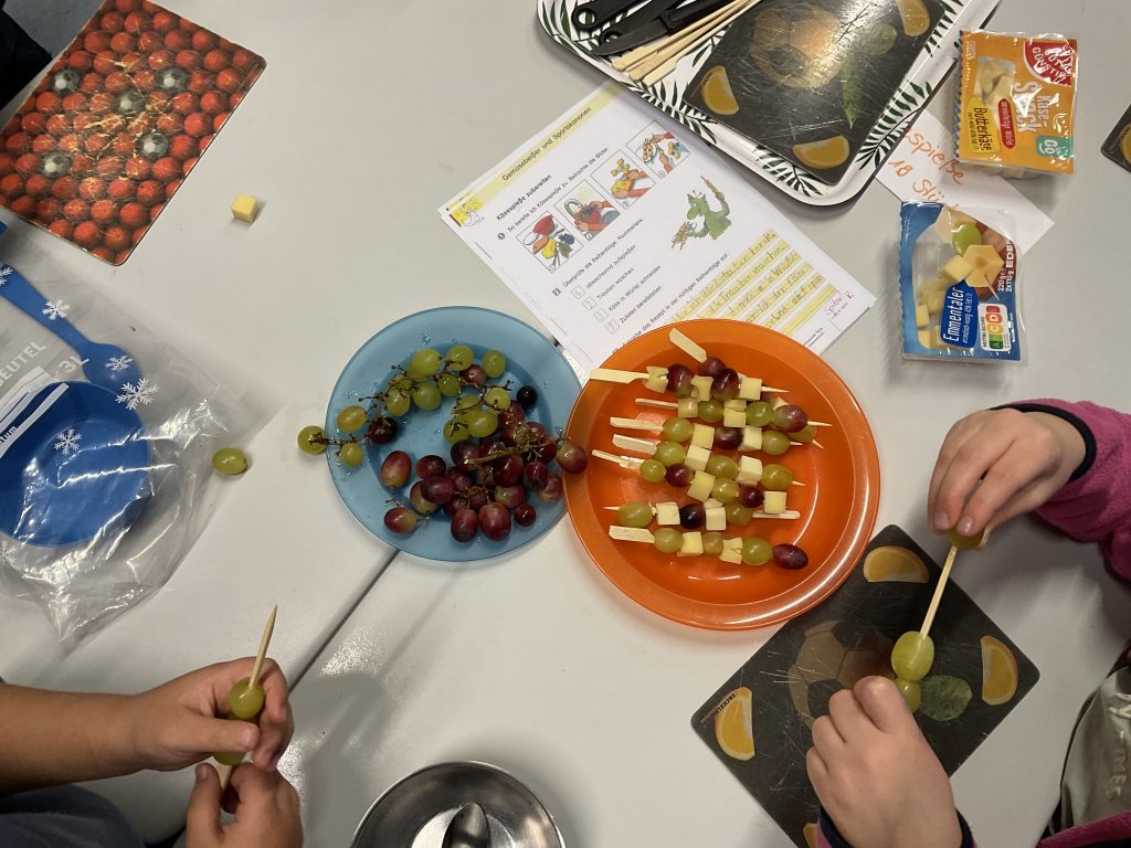Am Freitag, den 5. Dezember probierten wir unsere geschriebenen Rezepte aus. Es gab Obstquark, Käsespieße und Obstspieße. Alles hat sehr lecker geschmeckt!