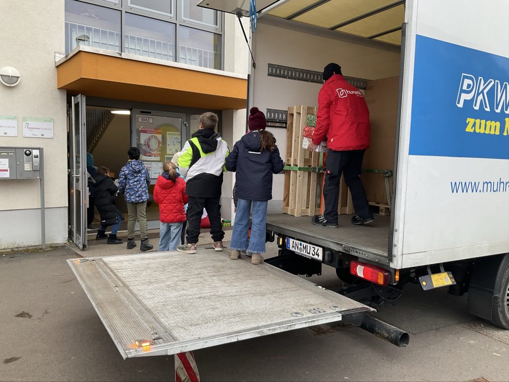 Eine lange Kinderkette half die Pakete in den LKW zu laden: