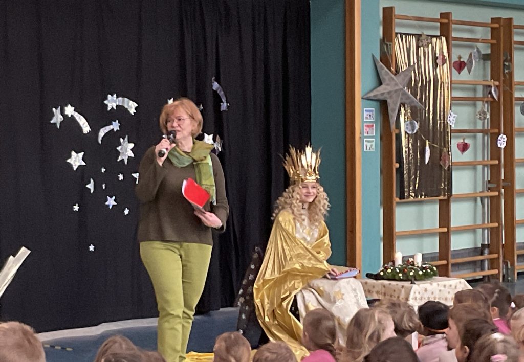 Das Nürnberger Christkind hat uns an unserer 2. gemeinsamen Adventsfeier gemeinsam mit einem Fernsehteam besucht. Zwei unserer Schüler grüßten das Christkind sehr herzlich. Wir haben eine Geschichte vorgelesen bekommen, haben gemeinsam gesungen, hatten Zeit für unsere neugierigen Fragen und jede Klasse durfte ein Foto mit dem Christkind machen. Was für eine zauberhafte Überraschung!
