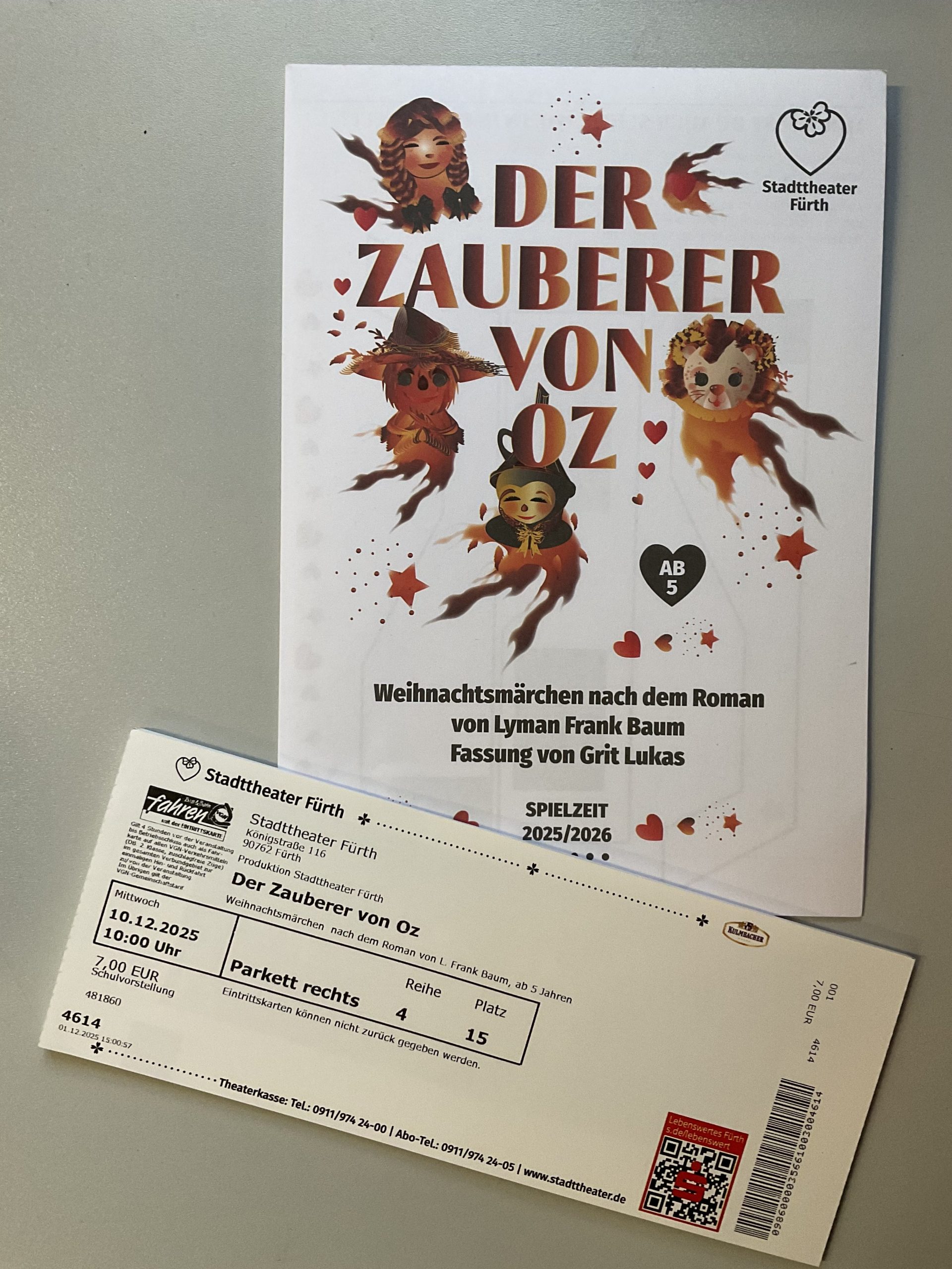 Am Mittwoch, den 10.12.2025 machten sich alle ersten, zweiten und dritten Klassen auf den Weg nach Fürth. Dort schauten wir uns im Stadttheater den Zauberer von Oz an. Es war sehr beeindruckend, lustig und auch ganz schön spannend.