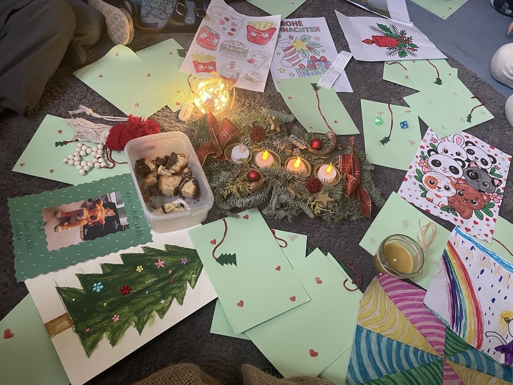 Dabei zeigte sich eindrucksvoll, wie vielfältig die Ideen der Kinder waren: Ein Kind brachte zum Beispiel einen selbstgebackenen Marmorkuchen mit – passend dazu hatten wir zuvor das Rezept im Deutschunterricht geschrieben. Zwei Kinder gestalteten Vorlagen für Weihnachtskarten für die ganze Klasse, andere rechneten freiwillig, malten Bilder aus oder setzten eigene kreative Projekte u.a. mit Holz oder Wolle um.