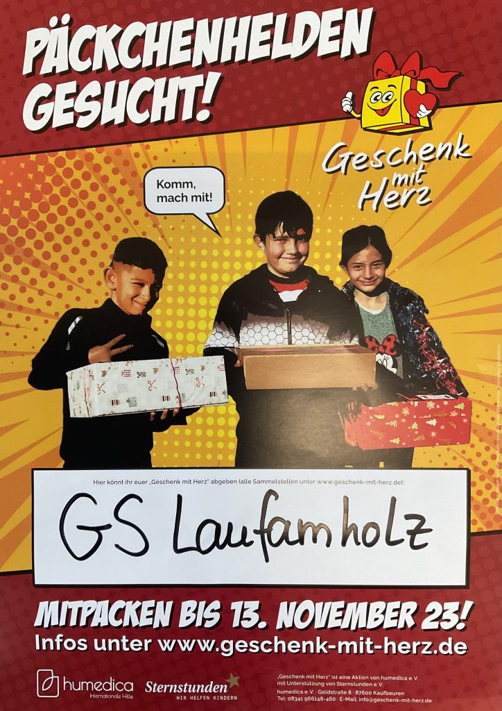 Jedes Jahr im November beteiligten wir uns an der Aktion „Geschenk mit Herz“ und setzen uns damit zum Ziel, zahlreichen benachteiligten Kindern in Bayern und vor allen auch Osteuropa eine Weihnachtsfreude zu bereiten. Gemeinsam mit der Hilfe zahlreicher Familien und Kinder unserer Grundschule konnten wir in den vergangenen Jahren immer wieder einen großen Berg Päckchen auf ihre Reise schicken.